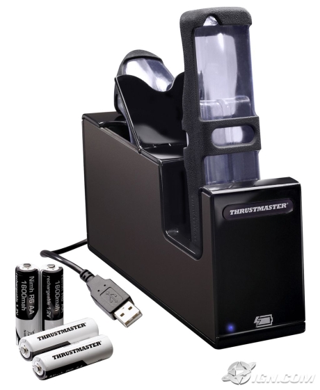 Agora vem a Picanha do Churrasco, o queijo do Hamburguer, a azeitona da empada. O T-Charge é um T-Care com um recarregador de pilhas com espaço para quatro pilhas (que já o acompanham) recarregáveis na base. O recarregador se liga diretamente a porta USB do Wii e impede aquela cabaiada (do dicionário Marcel de verbetes: um monte de cabos) pendurada. O mais legal é que a recarga é rápido e as pilhas são as Zirconiuns 1000 da Thrustmaster que não “acostumam” nem descarregam. Vale muito o seu dinheiro suado: US$ 29,99.
