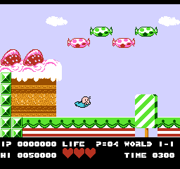 Eu não sei traduzir… mas se tivesse que arriscar acho que seria algo como “Bebê-rosa-shock-lindo-de-morrer-voador-ninja-atômico-mutante-celestial” (eu só não ponho a “A lenda do” por que não tem Densetsu no final). Esse jogo nunca foi lançado antes no ocidente… E ELE TINHA UMA BOA RAZÃO PARA ISSO. DEUS… SOU EU QUE ESTOU TOMANDO PÍLULAS DE LOUCURA OU DIANTE DA ENORME/MASSIVA/COLOSSAL BIBLIOTECA DE JOGOS BONS DO NES, LANÇADOS NO OCIDENTE, POR QUE ISSO? É um side scrolling fedido, génerico, que chupa conceitos de diversos outros jogos do mercado. Que vergonha Nintendo, e ainda cobrar 600 Wii points. Mas o pior, caro leito ainda está por vir….