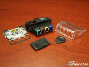 Se contássemos como teríamos que matá-los depois, mas a equipe Mini é muito grata a um certo distribuidor nacional que nos permitiu, e é claro, mais algumas pessoas a darem uma bela olhada no novíssimo “Guitar Hero On Tour” para o DS. E funciona que é uma beleza. Como não pudemos tirar fotos, pegamos algumas imprestadas da IGN, para explicar o que vimos. O game usa as duas telas, der, mas de um jeito muito muito original. Na entrada dos jogos de GameBoy Advance vai um sistema de quatro cores, semelhantes aos botões das guitarras dos consoles, só que um pouco mais macio. Os fios em si são representados por toques na tela sensível. A pergunta que não queria calar: Cansa? Sim… mas funciona muito bem – embora segurar a guitarra e olhar a Tv seja uma 5300 vezes mais confortável o sistema funciona sim. A questão agora é se o jogo vai pegar, já que a “Big N” lançará uma nova edição limitada do DS nas cores prata e preto, e com o logo de “Guitar Hero” estampado. Naturalmente, o pacote virá também com o game e o acessório de guitarra.