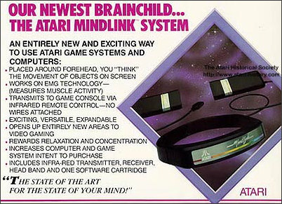 “Kill Pixels with your mind!!!” (Mate pixels com sua mente!!!). Essa frase é poderosa, mesmo sem a quantidade absurda de pontos de exclamação colocada no final dela. Jogar usando a mente tem sido o sonho de centenas de milhares de designers por anos a fio… e por enquanto é a pedra filosofal dos videogames. Só que, em 1984, Atari jurou que havia conseguido isso. Ela quase colocou no mercado o “Mind Link” uma espécie de coroa de plástico, que recebia e informava dados para o Atari 2600 através de rádio frequência. A questão é que o Mind Link não lia sua mente, ele fazia uma básica, fajuta, mal feita, fedida e xexelenta leitura do movimento das suas pálpebras. Isso mesmo! Conforme você movia suas pálpebras em pavor, tentando destruir legiões após legiões de naves inimigas em “space invaders”, um processador de 2 bits tentava descobrir onde seus olhos haviam se focalizado, pelo movimento das primeiras. E não, nem nos anos 80 usar as pálpebras para jogar videogame foi legal. A graça divina, no entanto, interviu, e a Atari acabou indo a falência antes do aparelho ser lançado em público. Alguns milhares de pessoas que fizeram a pré-encomenda receberam seus Mind-links, destruíram seus muscúlos supraoculares e vendederam esse veneno no E-Bay como curiosidade para pagar suas necessárias cirurgias. Se é Atari… é uma bosta!