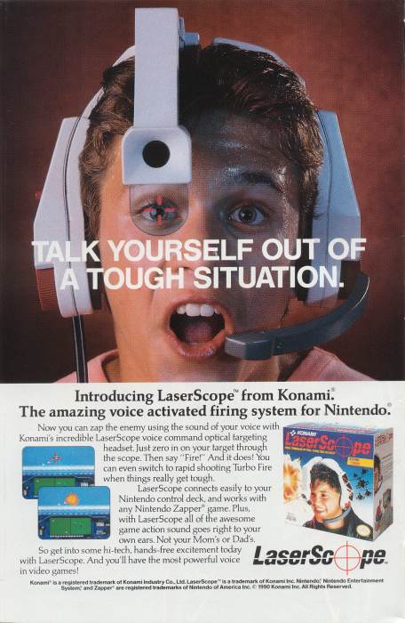 Agora já sentados, nos podemos desfrutar dos prazeres do poderoso “Laser Scope” da Konami. Eu sei o que você está pensando – Marcel, é a porra da Konami! Ela fez Contra e Castlevania, não pode ser assim tão ruim… Mas infelizmente pode… como pode. O Laser Scope é um “capacete” com fones de ouvido e um microfone, do qual parte um pequeno visor, que tem uma mira vermelha nele. Você passa a mira vermelha pela tela, grita bem alto FIRE, e lá se vai um tiro, assim como a pistola Zapper, também do NES. Assim como a Zapper, no entanto, ESSA PORRA É COMPLETAMENTE IMPRECISA, FUNCIONA QUANDO QUER E CANSA O PESCOÇO PACAS. Além disso, uma das sub funcionalidades do Laser Scope era servir como fone de ouvido, tanto para o seu NES, quanto para seus Walkmans e aparelhos de som – chegando ao ponto de ter na caixa a seguinte frase “Adults will love what they can’t hear!” (Adultos amarão o que não podem ouvir!). CLARO… experimente jogar de fone de ouvido gritando FIRE FIRE FIRE FIRE na sua sala e veja o amor nos olhos de seus pais! Ah, detalhe importante, o sensor do microfone detecta qualquer barulho, mesmo um farfalhar de folhas ou um bater de palmas, então se quiser gritar CACETE, CARALHO, PUTA, BOSTA, COISA DO INFERNO, ACERTA A PORRA DO PÁSSARO e outras frase do momento de raiva, sinta-se a vontade. O Laser Scope vai atirar para você.