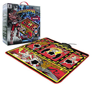 Falando em levantar da cadeira, vamos levar esse assunto a um novo level, ainda mais dantesco. O Ultimate Kickboxing, de uma empresa desconhecida, é uma combinação xexelenta e sem vergonha de um tapete de dança (com comandos como esquerda, defesa e salto) com um conjunto de sensores imprecisos e vagabundos em formato de pulseiras e tornozeleiras. Mas a pergunta que fica na sua mente é: Será que minha experiência gamística com Street Fighter (ou seja lá o raio de game de luta que você vai sacrificar essa porra para usar) vai ficar melhor se eu me vestir de power ranger de baixo orçamento e usar um tapete de plástico? Nossa resposta: Não!! E se sua namorada o ver assim, ela vai virar uma freira lésbica. Uma nova fronteira em termos de babaquice, mas não responda ainda porque….