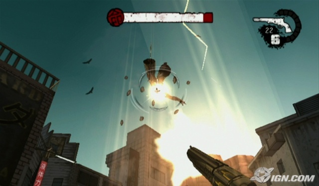 mas também usa o Wii mote para a mira e para “olhar” o cenário, mostrando aonde você irá se apertar o “para cima” no analógico. Só que se ele não estiver travado em um inimigo pode (não sempre, mas algumas vezes) fazê-lo literalmente ficar olhando o chão, ou algum detalhe do cenário, para cima ou para baixo da linha de ação, enquanto sua bunda é surrada sem dó pelos seus inimigos. A trava nos inimigos, controlada no Nunchuk, diminui um pouco o problema, mas não resolve o questão de ter que virar-se rapidamente no game. Quando você vai se virar deve movimentar o Wii mote para fora da “bounding box”, uma caixa imaginária, que pode ser regulada em tamanho pelo jogador, que indica onde o personagem deve começar a se mexer. Só