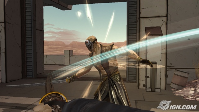 experiência ainda melhor. As armas tem um tom meio fantasioso e parecem itens personalizados ao invés de objetos criados em série e a suas espadas (você usa mais de uma ao longo do game) são lindas – podendo ser vistas na tela, em todas as posições e ângulos, enquanto você as manipula para se defender ou defletir projéteis. Quando você corta com a espada, a Ubisoft achou um atalho gráfico para não ter que animar ataques por todo e qualquer ângulo: Você vê apenas o corte da espada, uma linha se foi fraco, várias linhas mais escuras se foi mais forte. A diferença entre os dois e o quanto de “braço” você põe no golpe. Um dos games mais lindos do Wii até hoje.