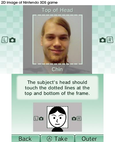 A primeira é a criação via câmera. Olhe em direção a tela e escolha criar a partir de uma foto. A câmera interna irá bater uma foto de seu rosto que será então transformado em uma caixa em 3D. Um Mii, então, se verá na árdua tarefa de tentar tirar a caixa da cabeça, o que resultará em risadas suas, e quando ele atingir o objetivo, em uma versão caricata do rosto cuja foto foi batida. É funcional e bem engraçado… mas o resultado final pode deixar um pouco a desejar – ao que parece o software utilizado guia-se por linhas e reentrâncias no rosto, logo, pessoas como eu e a Michela, mais gordinhas, acabam por ficar sem muitos detalhes no avatar pela dificuldade do sistema em encontrar pontos de escaneamento. Testes empreendidos mostram que os resultados variam de perfeitos a completamente inacurados. Quem sabe com um patch no futuro? Mas não se preocupe, você pode alterar o rosto após a foto ser tirada. Aliás… a segunda diferença está aí… Além de ser capaz de colocar e tirar olhos, tipos de cabelos e coisas do tipo, agora você também pode editar o horizontal e o vertical dos objetos colocados, criando olhos semicerrados ou maiores, ou bocas em posições diferentes dos defaults, etc…