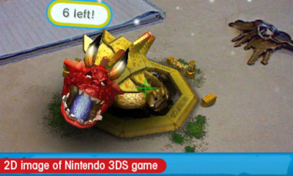 voador com chifres e irá animá-la. Agora os capacetes voarão a sua volta, surgindo do nada e você terá que movimentar o 3DS… sim.. de pé e andando… tentando mirar neles usando as câmeras do aparelho e destruir as criaturas bisonhas jogando bolinhas nelas. Se acertar na boca… elas mordem a bola, soltam um ganido e explodem… e você ganha um “Perfect” do game. Glorioso e encantador. E você pode apertar R ou L a qualquer momento e capturar fotos, em 3D, do pandemônio solto em sua tela.
