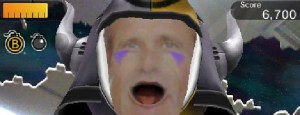 Mas não acaba aí… depois de um número de fases você entra no modo “UFO CREW” (algo como “tripulação de disco voador”). E o que o modo faz é randomicamente procurar rostos em suas fotos batidas no 3DS e transformá-los em novos inimigos. É muito engraçado e surpreende… eu me vi lutando com um amigo que fotografei… de repente… e dentro do ônibus voltando para casa. Sensacional.
