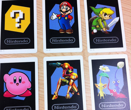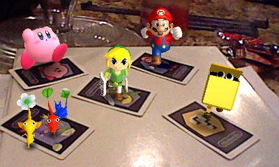 Eu guardei o melhor para o final! Todo o 3DS vem com um pacotinho de pequenos cartões que possuem poderes cósmicos e fenomenais. Quando observados no ângulo, na iluminação e na distância corretas (se você tiver feito seus sacrifícios regularmente para o grande deus crocodilo Ofler… e plantado bananeira durante seis dias em jejum) várias coisas incríveis podem acontecer. Um deles tem o logo da Nintendo e os outros cinco tem fotos do Mario, Link, Samus Aran, Kirby e os Pikmin.