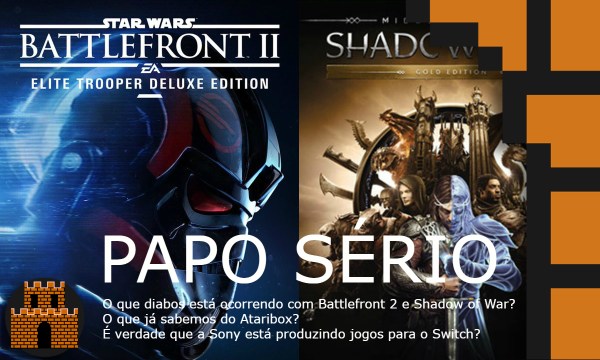 Vocês REALMENTE queriam a opinião/explicação do Marcel sobre a Sony fazendo jogos para o Switch, sobre o que diabos já sabemos do Ataribox e sobre as controvérsias em torno de Star Wars Battlefront 2 e LotR Shadow of War.